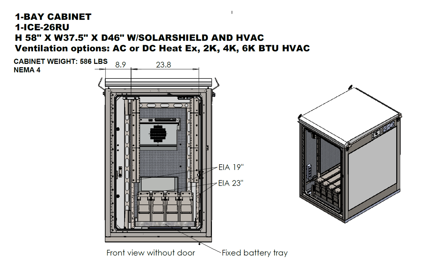 The 1-ICE-26RU Telecom Cabinet by Iceberg Cabinets is a durable, weatherproof solution for outdoor network equipment. Measuring 58"H x 37.5"W x 46"D, it includes SolarShield, HVAC, and AC/DC heat exchanger options (2K–6K BTU). Built NEMA 4 rated for maximum protection and reliability.