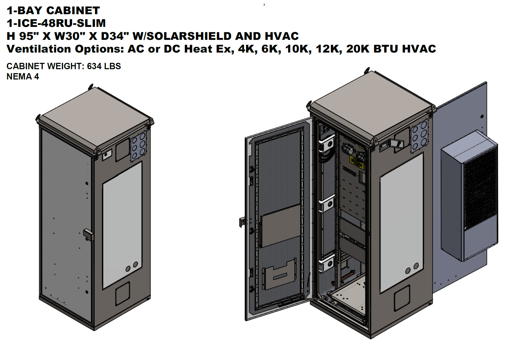 The 1-ICE-48RU-SLIM Telecom Cabinet from Iceberg Cabinets is designed for high-capacity outdoor installations. Standing 95"H x 30"W x 34"D, it includes SolarShield and HVAC with multiple cooling options (4K–20K BTU). NEMA 4 rated, it ensures superior weather protection and equipment reliability.