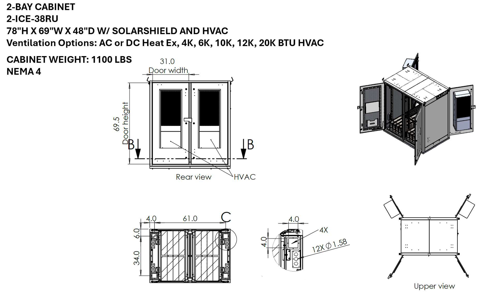 The 2-ICE-38RU includes dual rear access doors for easy maintenance and multiple ventilation options, including AC or DC heat exchangers and HVAC systems ranging from 4K to 20K BTU. These customizable cooling systems ensure optimal performance and equipment longevity.