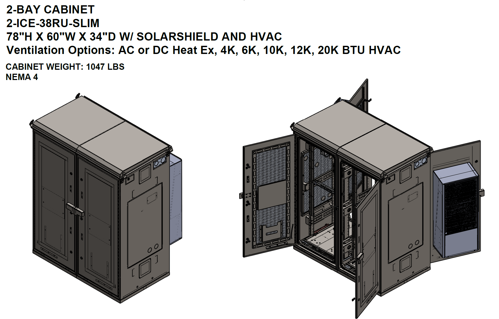 The 2-ICE-38RU-SLIM Telecom Cabinet from Iceberg Cabinets delivers robust outdoor protection with a dual-bay design. Measuring 78"H x 60"W x 34"D, it features SolarShield, HVAC, and AC/DC heat exchanger options (4K–20K BTU). NEMA 4 rated for maximum durability and performance in all environments.