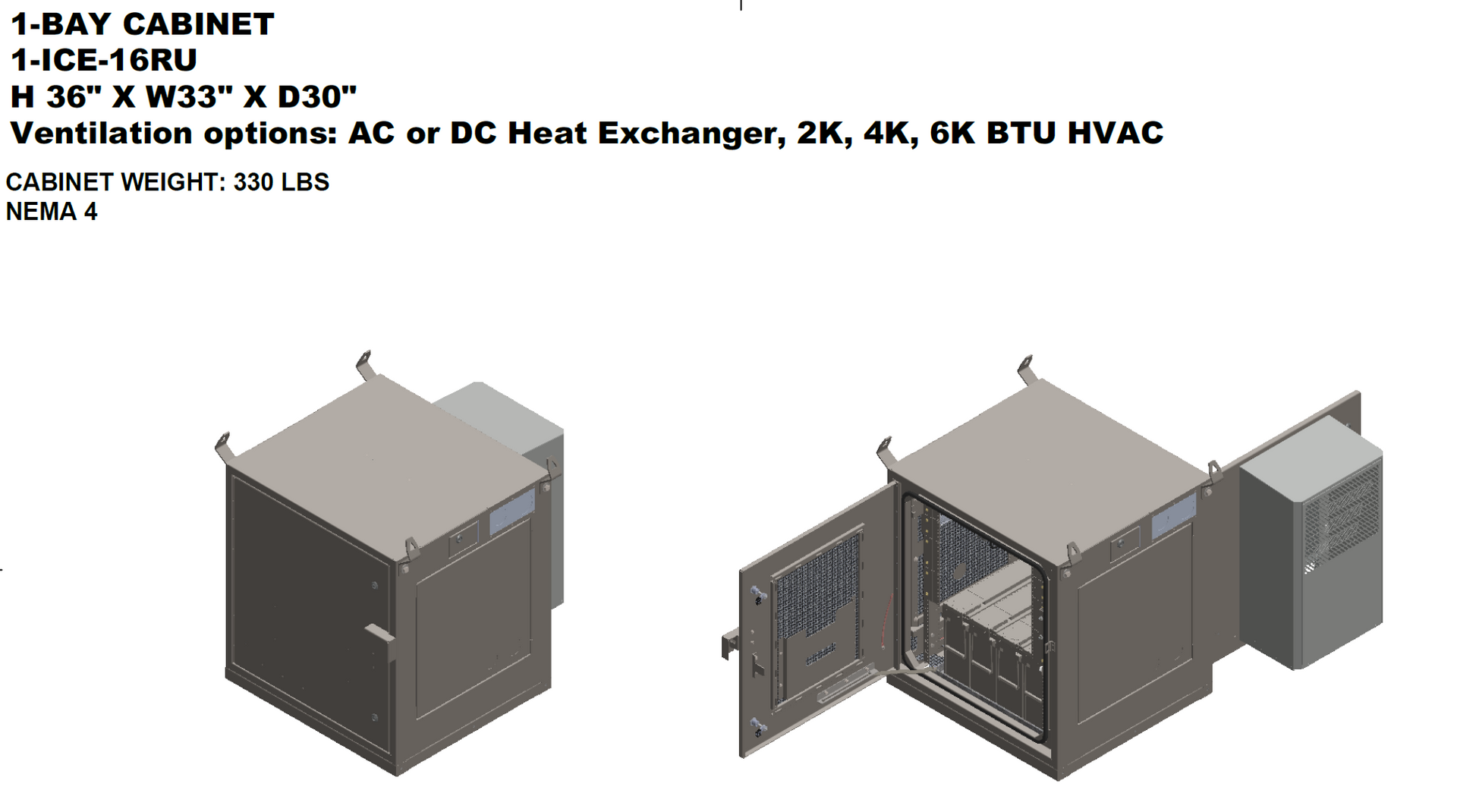 The 1-Bay Telecom Cabinet 1-ICE-16RU is built for secure and efficient equipment housing. Measuring 36"H x 33"W x 30"D, it features AC or DC heat exchanger options with 2K–6K BTU HVAC cooling. With a NEMA 4 rating and 330 lbs weight, it ensures durability, weather protection, and reliability.