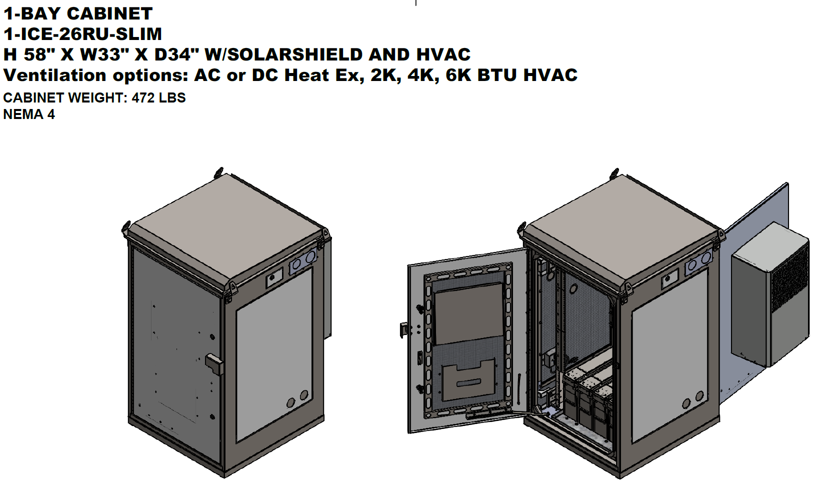 The 1-ICE-26RU-SLIM Telecom Cabinet from Iceberg Cabinets offers reliable outdoor protection with a slim design. Measuring 58"H x 33"W x 34"D, it features SolarShield and HVAC options for superior cooling (2K–6K BTU). Built NEMA 4 rated for secure, weatherproof performance.